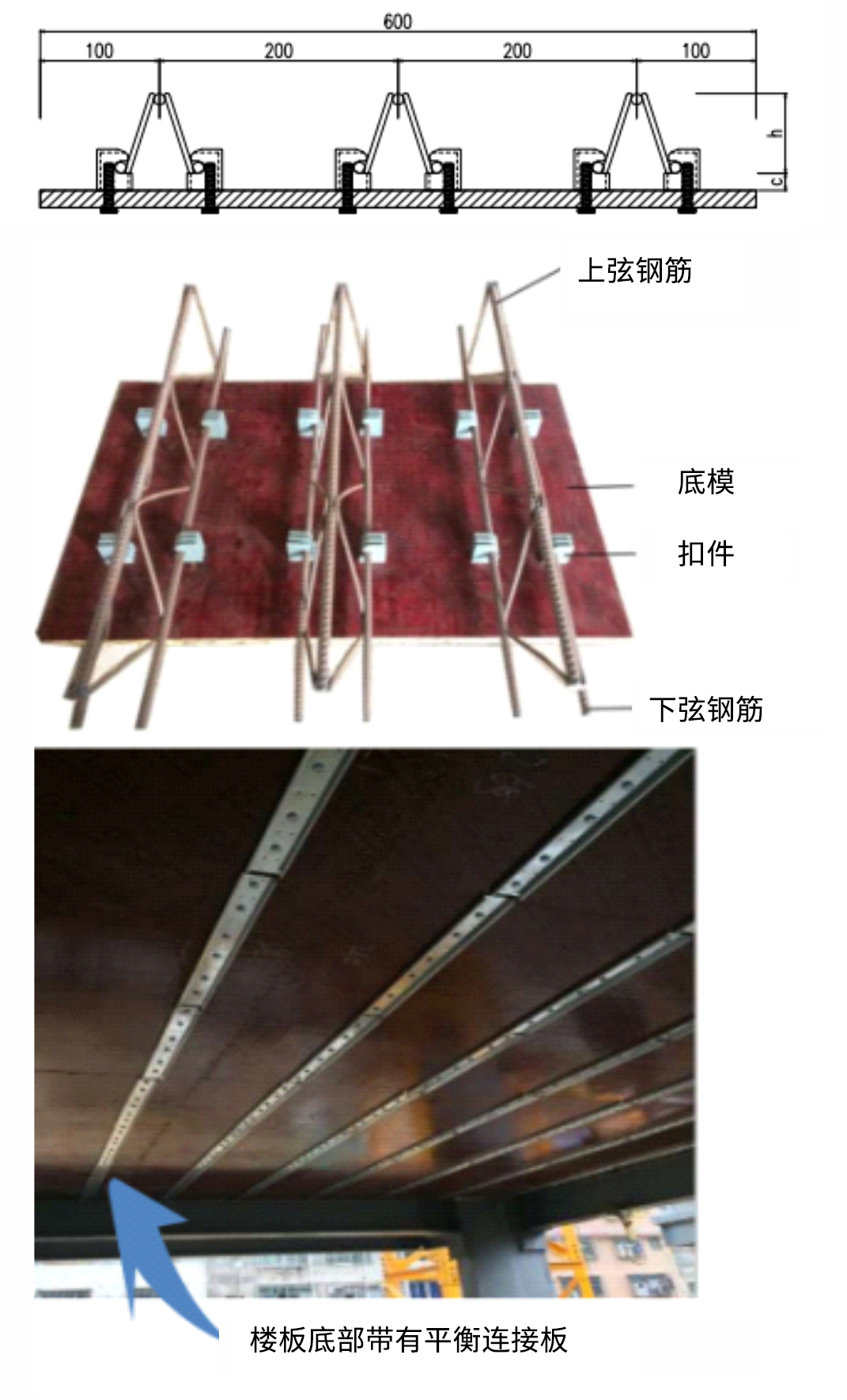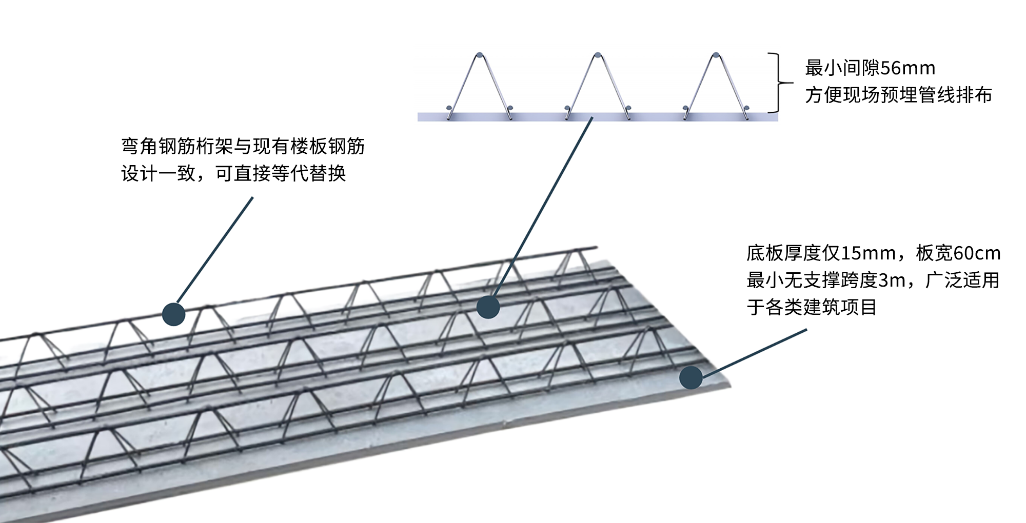 可拆底模鋼筋桁架樓承板:通過底板扣件與螺絲連接,澆筑完成后,只需 先電動扳手卸掉底板螺絲,再拆除底板,無需二次抹灰(通過中益/泰博公司自主 研 發(fā)的底部連接片技術,確保了底部的平整度)。