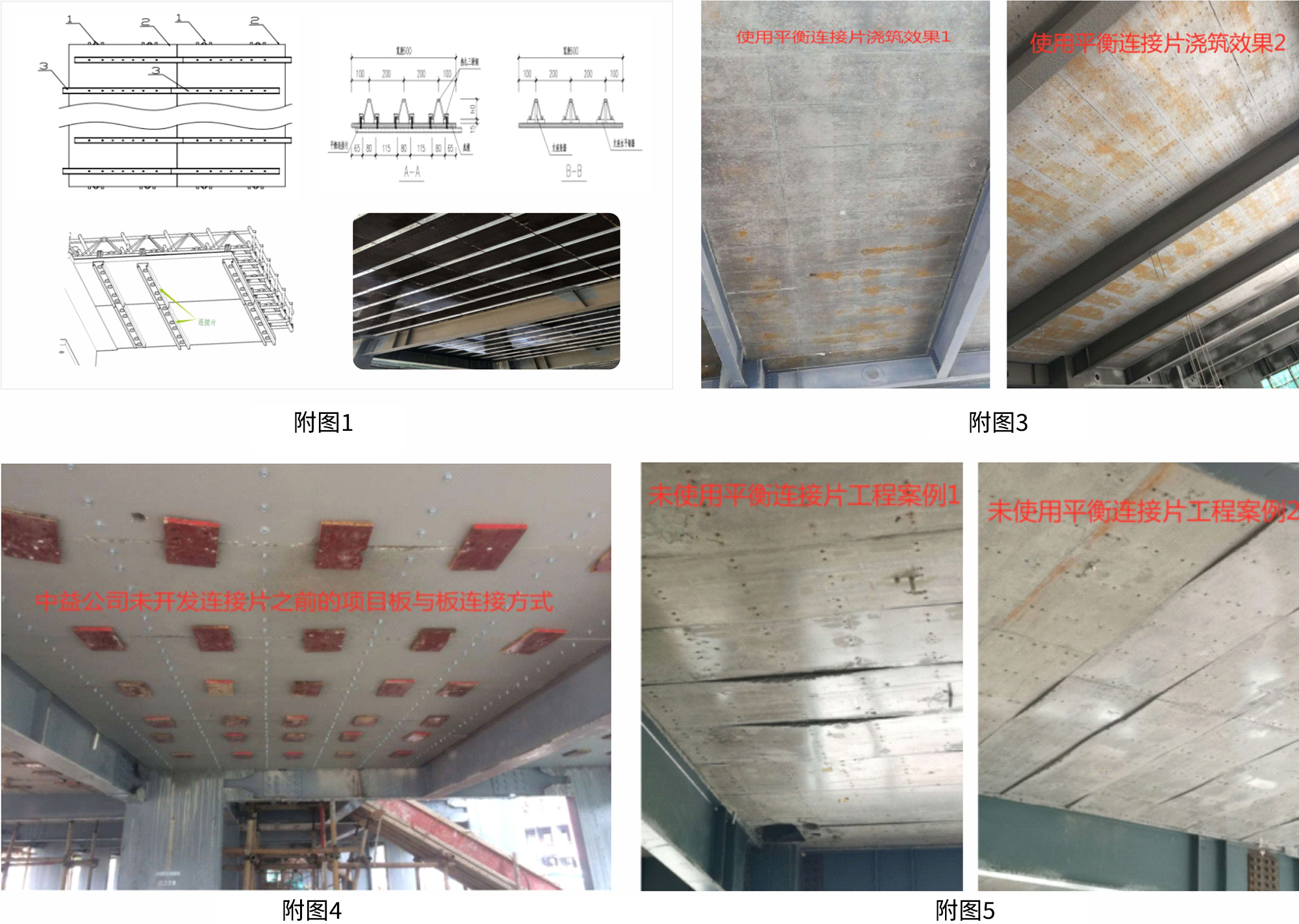 (3)從澆筑完后的效果對比:可拆式樓承板原來鋪裝完成后,在沒有連接片的時候采用的是下面用模板打 自攻螺絲,使板與板之間連接成一個整體平面(見附圖四),這樣的施工效 率低下,成本高, 澆筑后質量不能保證,這是某公司無連接片澆筑混凝土后 的效果見(附圖五),所以自從中益/泰博的裝配可拆式鋼筋桁架樓承板的底 部連接片技術開發(fā)以后(中益/泰博自主研發(fā)的專利技術),底部每 400mm間 距的有一檔平衡連接片(見附圖一)交叉錯位連接,防止了板與板之間的錯位 ,使得板面之間能成為一個平面,保證了樓板底部的平整度,并且提高了施 工速度,質量做到無需二次抹灰,可直 接移交裝修。(見附圖三)