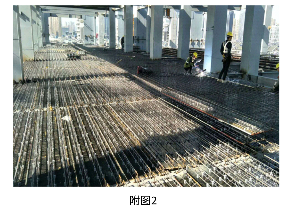 裝配可拆式鋼筋桁架樓承板,實際案例(龍湖集團浙江公司紫荊港項目)6-7 人一天可鋪裝1000㎡(見附圖二),可有效縮短工期比自承式樓承板的安裝 快百分之三十的速度,拆除比較方便,1400㎡ 的板面6人一天即可拆除完畢。 |
